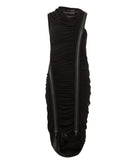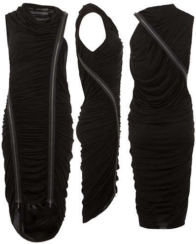 A Below The Knee Bodycon Dress Which Features All Over Ruching And Double Asymmetrial Zip Detail