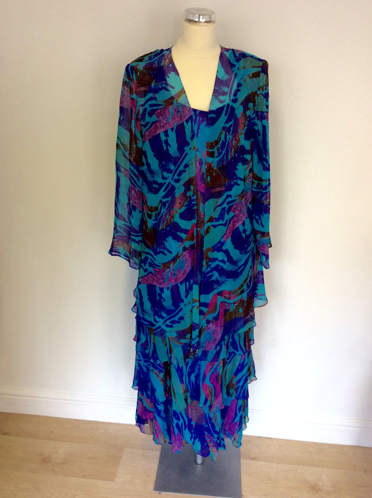 CATIVA TURQOUISE PRINT SILK DRESS & OVER BLOUSE/JACKET SIZE 16