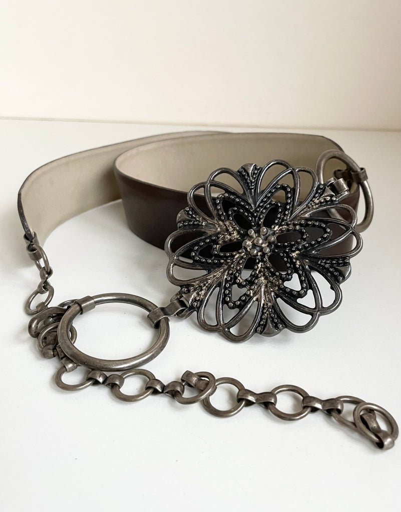 CLARA PERRI BROWN LEATHER DECORATIVE DETAIL & CHAIN FASTENING BELT