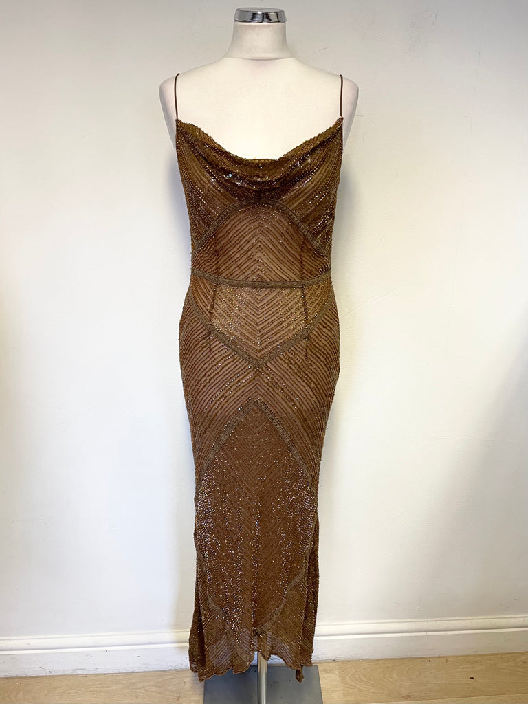 MONSOON BRONZE BEADED & SEQUINNED SILK STRAPPY EVENING DRESS SIZE 12