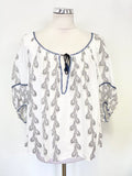 DESIGNER THIERRY COLSON WHITE WITH BLACK & BEIGE FEATHER PRINT PHEASANT TOP SIZE S