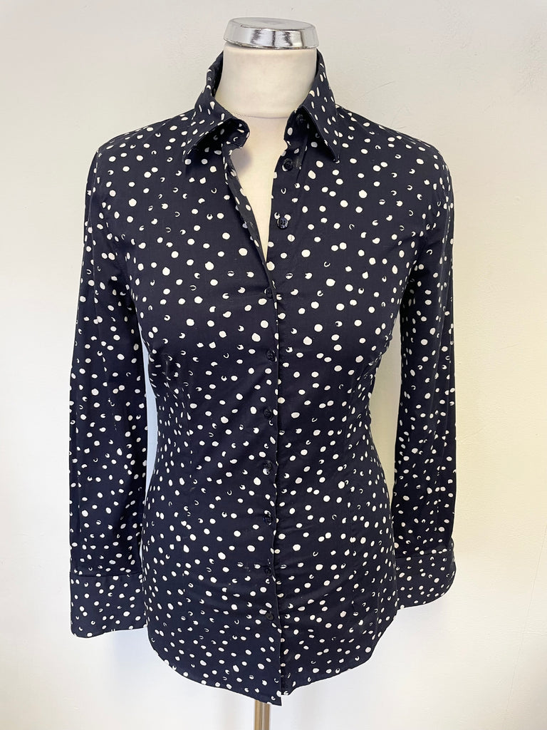 HAWES & CURTIS NAVY & WHITE SPOT PRINT COLLARED FITTED LONG SLEEVED SHIRT SIZE 8