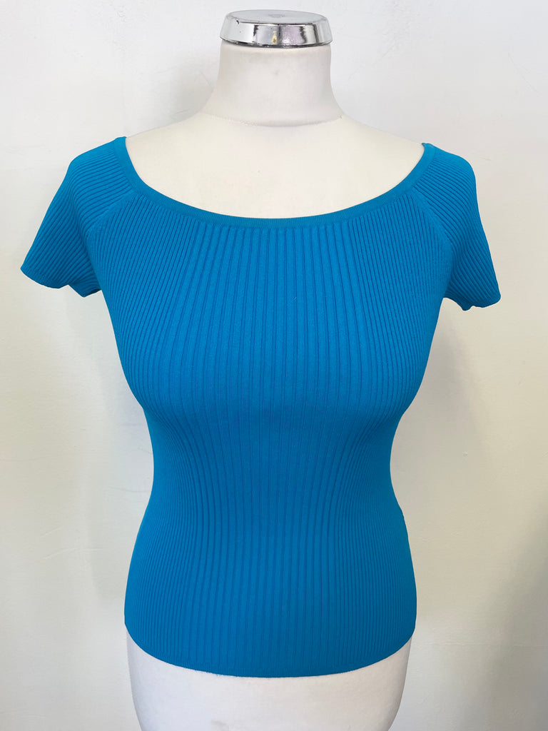 KAREN MILLEN TURQUOISE RIB KNIT BOAT NECKLINE CAP SLEEVE TOP SIZE M