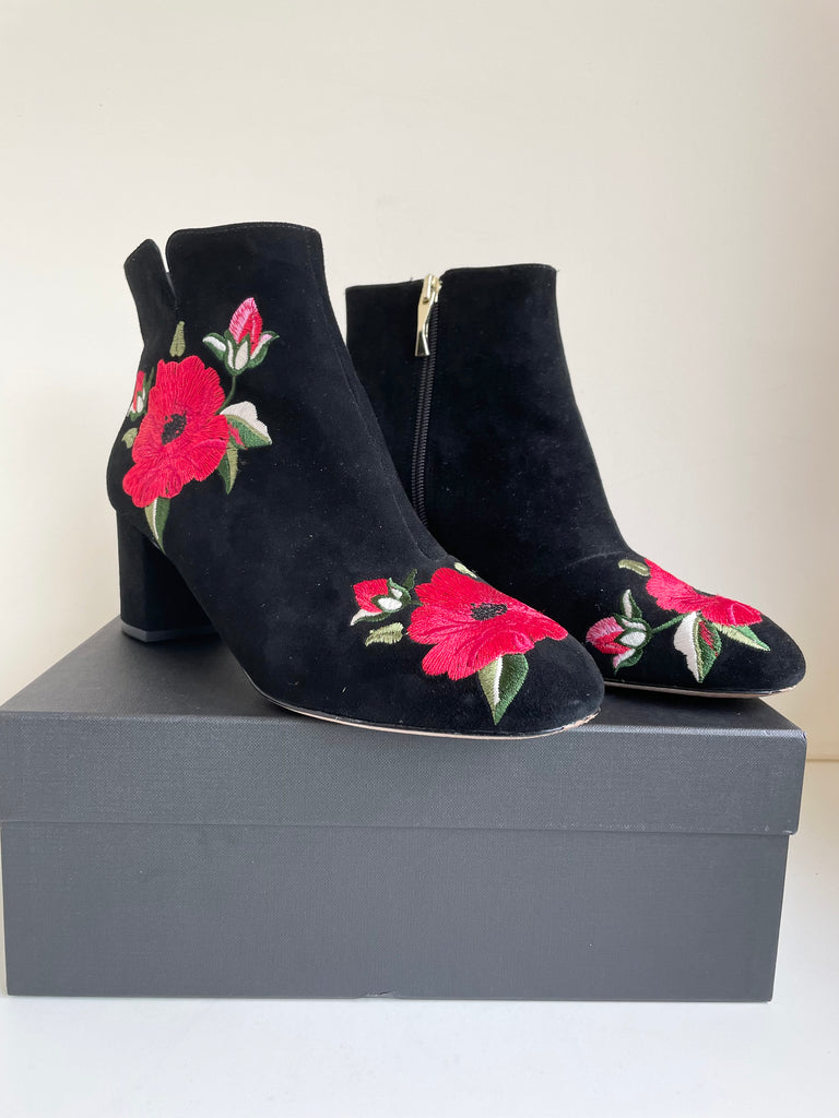 KATE SPADE BLACK SUEDE & RED EMBROIDERED POPPY ANKLE BOOTS