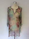 LINI MINT GREEN & PINK FLORAL PRINT EMBELLISHED SILK BEACH COVER UP/ TOP SIZE 10