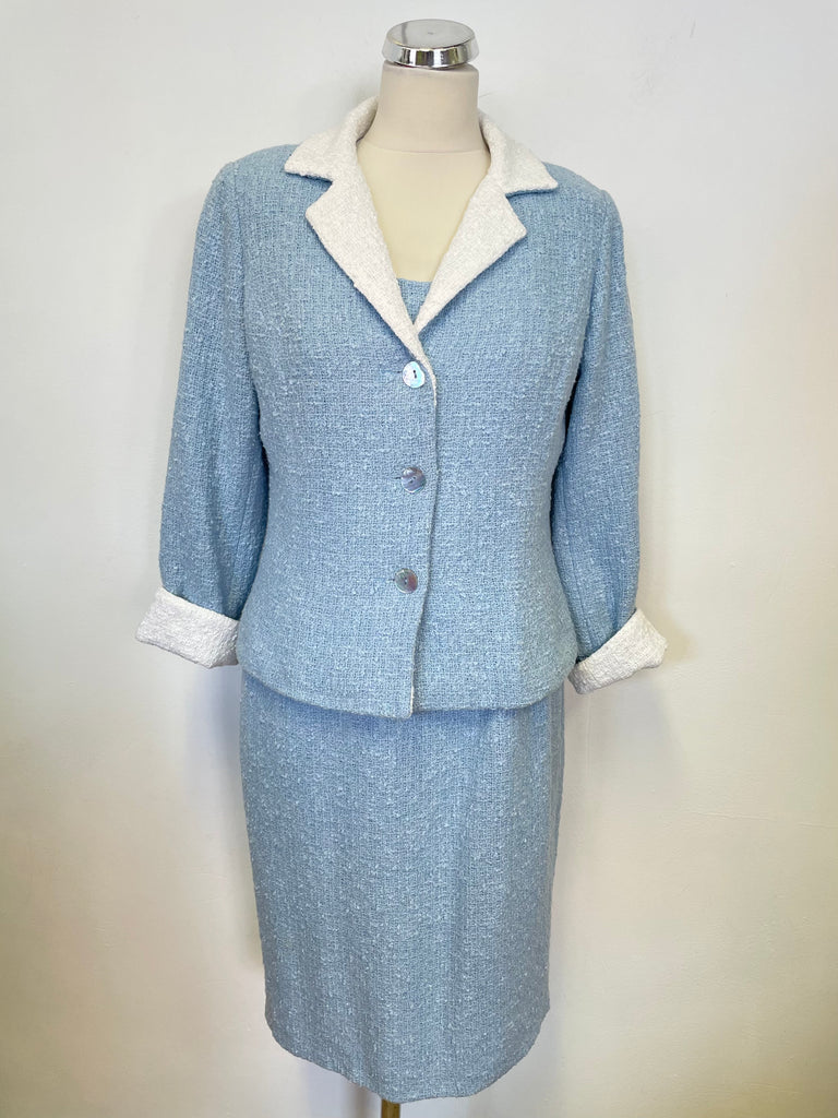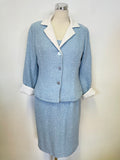 LK BENNETT LIGHT BLUE & WHITE TRIM BOUCLE COTTON MIX PENCIL DRESS & JACKET SUIT SIZE 42 UK 12
