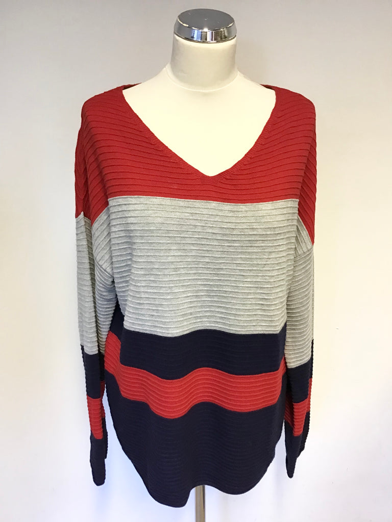 OUI RED, GREY & NAVY STRIPE V NECK JUMPER SIZE 14