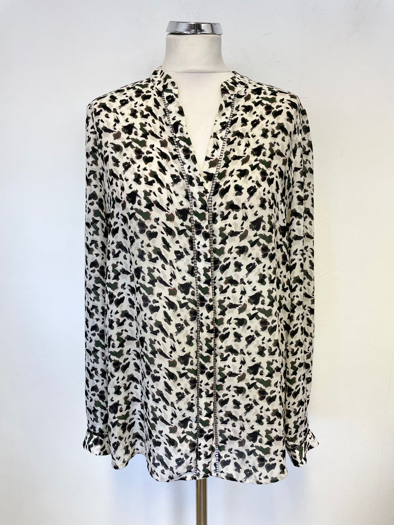 REISS BELVA IVORY GREEN, BLACK PRINT V NECK LONG SLEEVED BLOUSE SIZE 14
