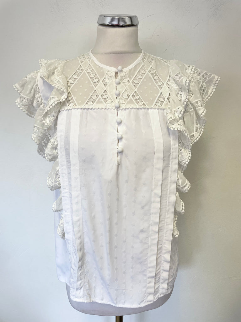 SANDRO WHITE LACE FRILL TRIMMED CAP SLEEVE TOP