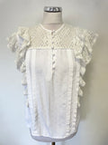 SANDRO WHITE LACE FRILL TRIMMED CAP SLEEVE TOP SIZE 1 UK 8/10