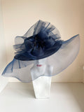UNBRANDED NAVY BLUE FABRIC MESH BOW & FEATHER TRIM HAT WITH WIDE MESH BRIM