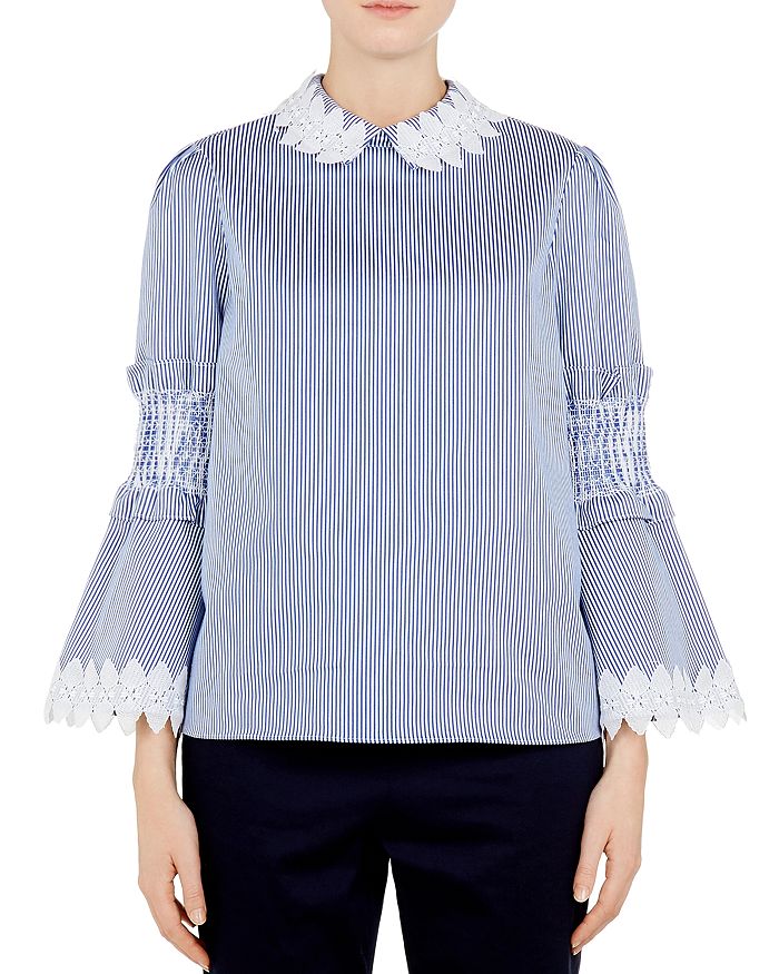 BRAND NEW TED BAKER CERENNA BLUE STRIPE LACE FLUTED LONG SLEEVE TOP SIZE 2 UK 10/12