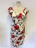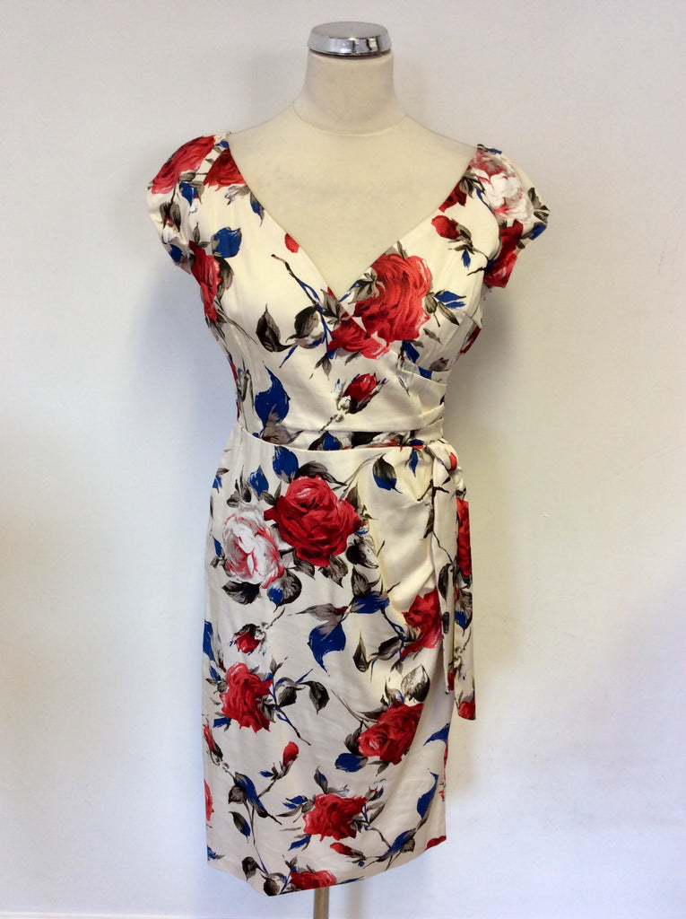 BRAND NEW THE PRETTY DRESS COMPANY CREAM,RED & BLUE FLORAL PRINT CARMEN HOURGLASS PENCIL DRESS