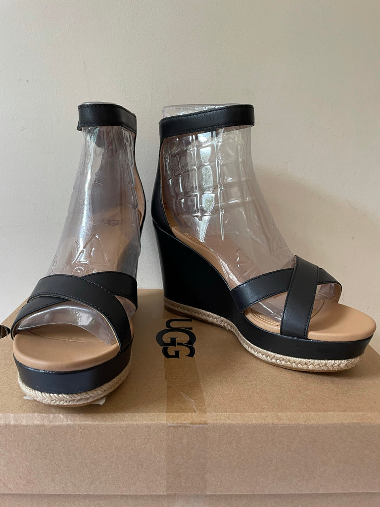BRAND NEW IN BOX UGG EZRAH BLACK LEATHER WEDGE HEEL SANDALS