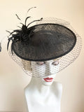 BLACK HATINATOR WITH FEATHERS AND NET TRIM ON HEADBAND