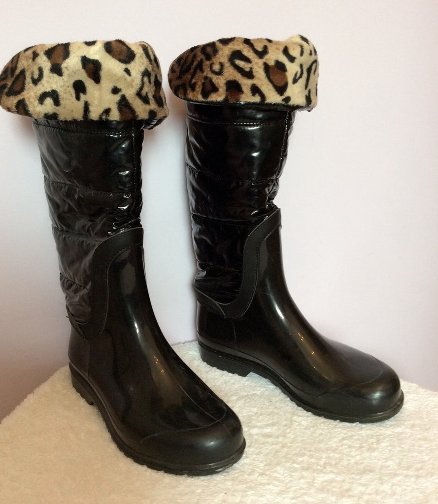 Leopard Print Faux Fur Trim Black Wellington/Rain Boots Size 6/39