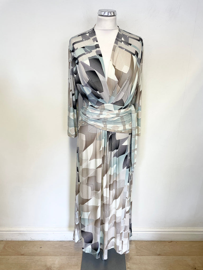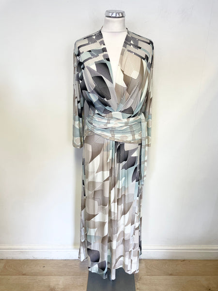 ILSE JACOBSEN DUCK EGG, IVORY & BROWN SHADES PRINT 3/4 SLEEVE STRETCH MIDI DRESS SIZE L