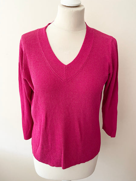 JAEGER PINK RIB KNIT COTTON BLEND V NECK 3/4 SLEEVED JUMPER SIZE L