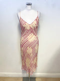 PEARCE FIONDA CREAM,RED & PINK PRINT BEAD TRIMMED BIAS CUT FINE STRAP DRESS SIZE 10