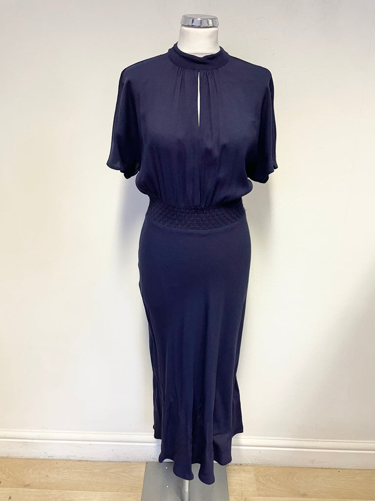 WHISTLES NAVY BLUE SHORT SLEEVED ELASTICATED SHIRRED WAIST MIDI DRESS SIZE 8