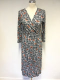 WHITE STUFF GREY,TEAL,WHITE & ORANGE PRINT WRAP STYLE JERSEY DRESS SIZE 10