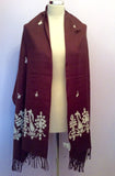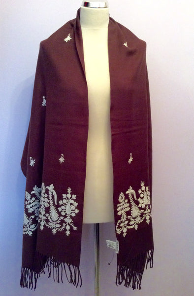 Brand New Planet Dark Brown & White Embroidered 100% Wool Shawl/Wrap