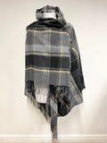 UNBRANDED GREY,BLACK & CAMEL CHECK WRAP AROUND FRINGED BUTTON FASTEN CAPE/WRAP