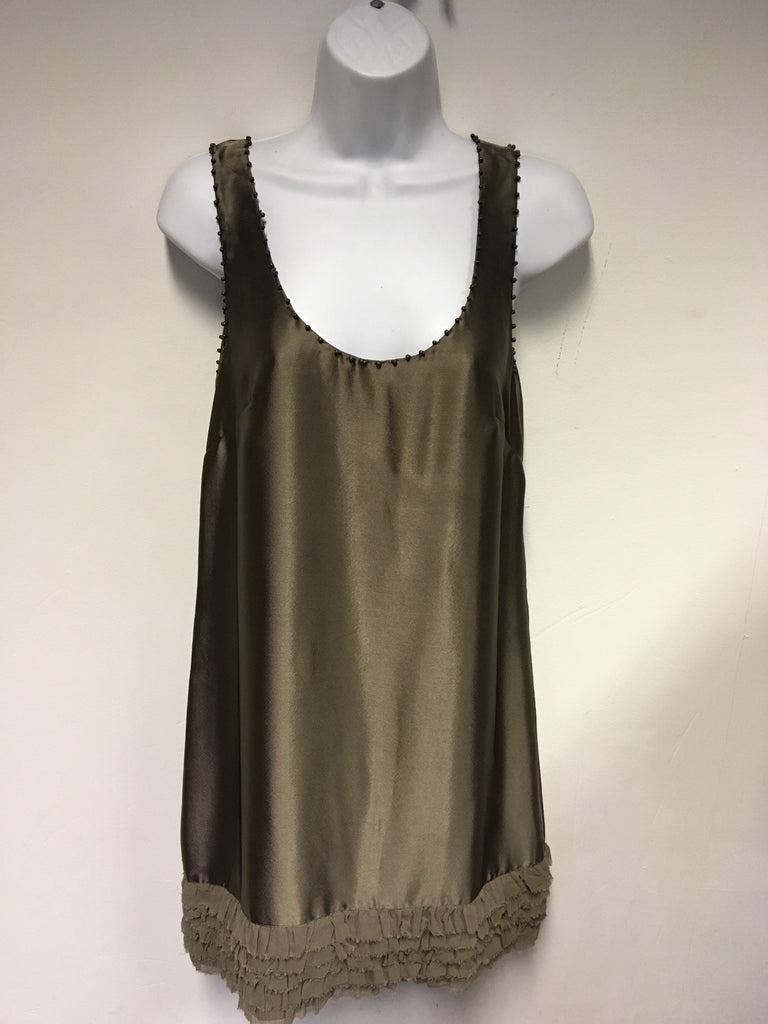 FRENCH CONNECTION BRONZE BEADED TRIM WITH SILK FRILL MINI DRESS SIZE 8
