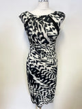 KAREN MILLEN BLACK,IVORY & GREY PRINT SLEEVELESS PENCIL DRESS SIZE 10