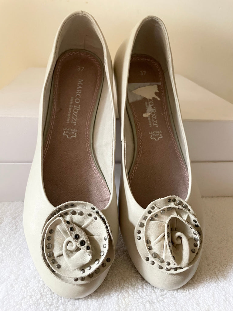 MARCO TOZZI CREAM LEATHER STUDDED FLOWER TRIM FLATS SIZE 4/37