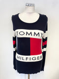 TOMMY HILFIGER NAVY BLUE,RED & OFF WHITE COLOURBLOCK LONG SLEEVED JUMPER SIZE L