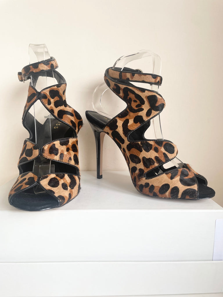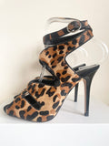 BRAND NEW REISS BROWN LEOPARD PRINT PONYSKIN LEATHER ANKLE STRAP HIGH HEEL SANDALS SIZE 5/38