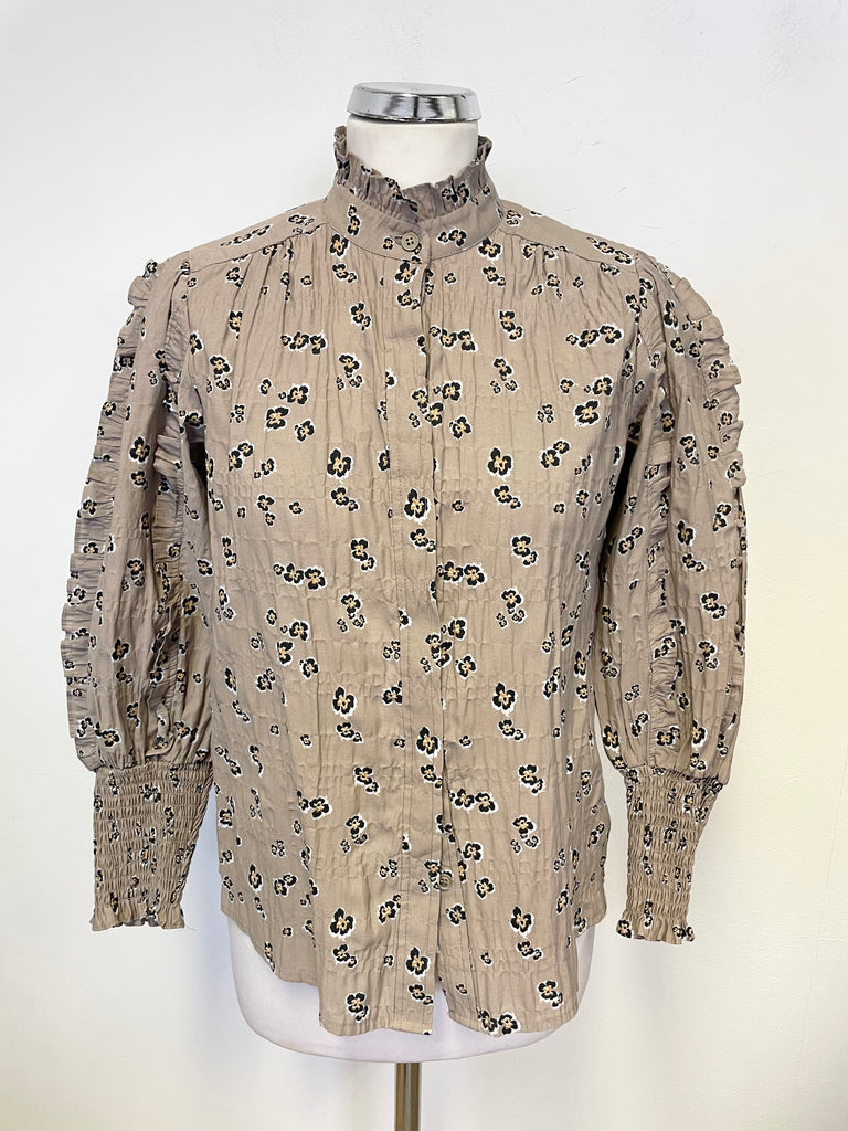 LEVETE ROOM BEIGE & BLACK FLORAL PRINT FRILLED 3/4 SLEEVED BLOUSE SIZE S