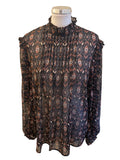 OUI BLACK & BROWN PRINT FRILL TRIM LONG SLEEVE BLOUSE SIZE 12