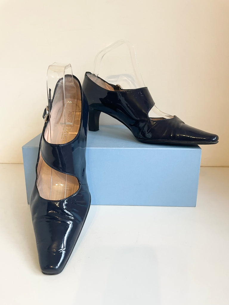 RUSSELL & BROMLEY NAVY BLUE PATENT LEATHER BUCKLE STRAP HEELS SIZE 6/39