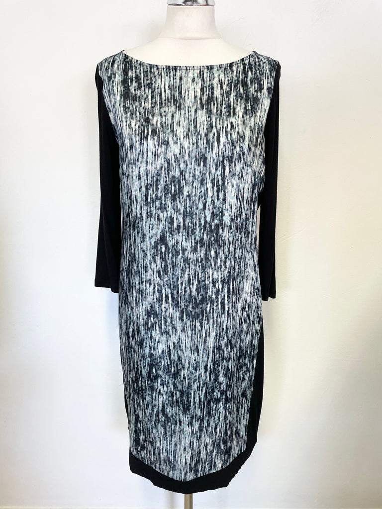 DAMSEL IN A DRESS BLACK WITH GREEN & WHITE PRINT 3/4 SLEEVE SHIFT DRESS SIZE 12