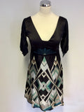 KAREN MILLEN BLACK, SILVER,GREEN & GOLDS GEOMETRIC PRINT SILK DRESS