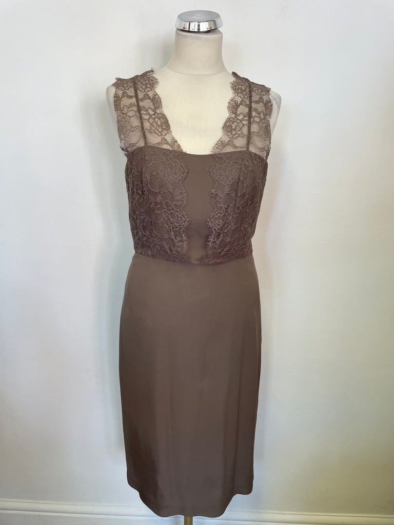 LK BENNETT BROWN SILK LACE STRAPS & BODICE PENCIL DRESS SIZE 10