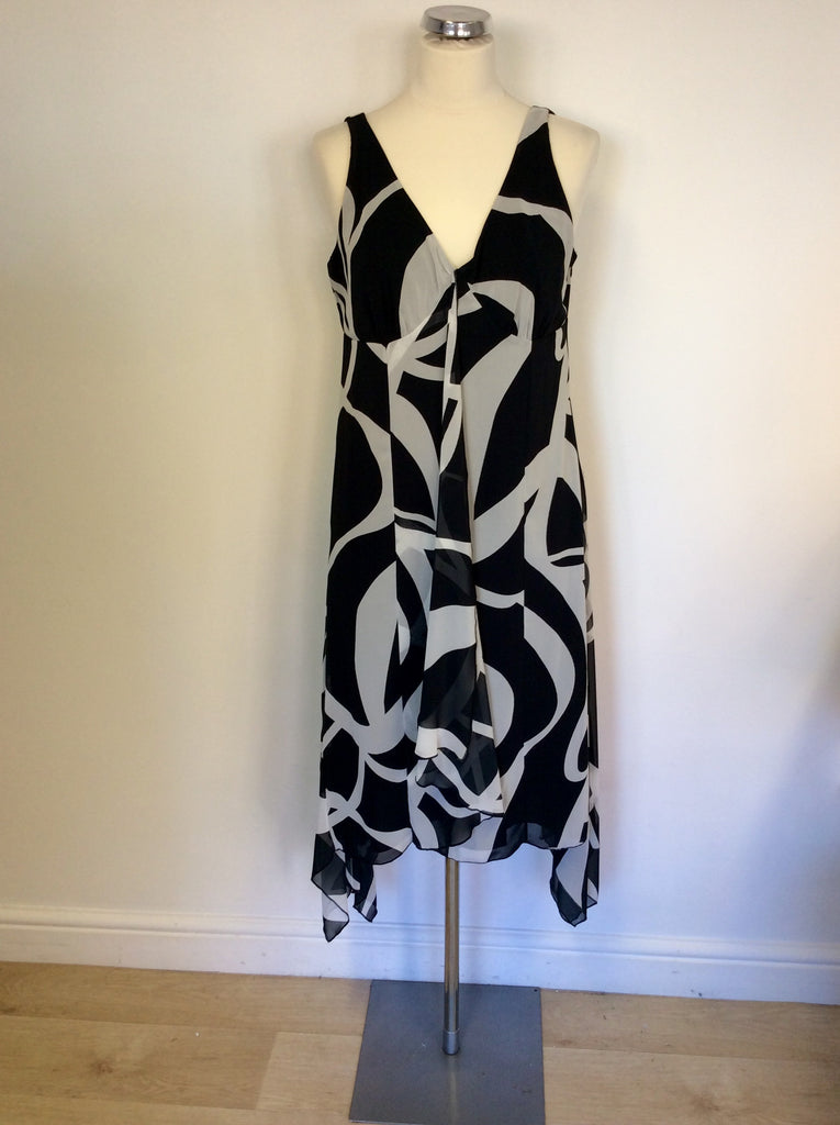 MARKS & SPENCER AUTOGRAPH BLACK & WHITE PRINT HANDKERCHIEF HEM DRESS SIZE 14 PETITE