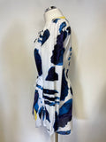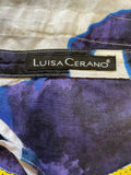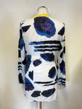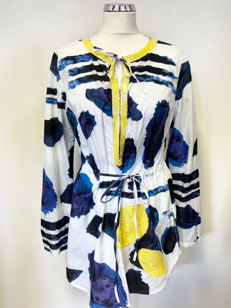 LUISA CERANO BLUE & WHITE WITH YELLOW SEQUIN TRIMMED TUNIC TOP SIZE 14