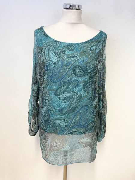 N AND WILLOW TURQUOISE PAISLEY BOAT NECK 3/4 SLEEVED TOP SIZE M