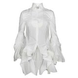 HAS A STAND UP MANDARIN COLLAR WITH A PLEATED BIB TO FRONT WITH BUTTON FASTEN