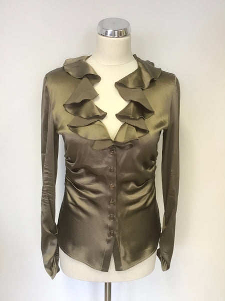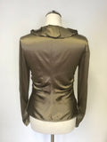 ARMANI COLLEZIONI BRONZE SILK RUCHED & FRILL V NECKLINE FITTED BLOUSE SIZE 42 UK 12