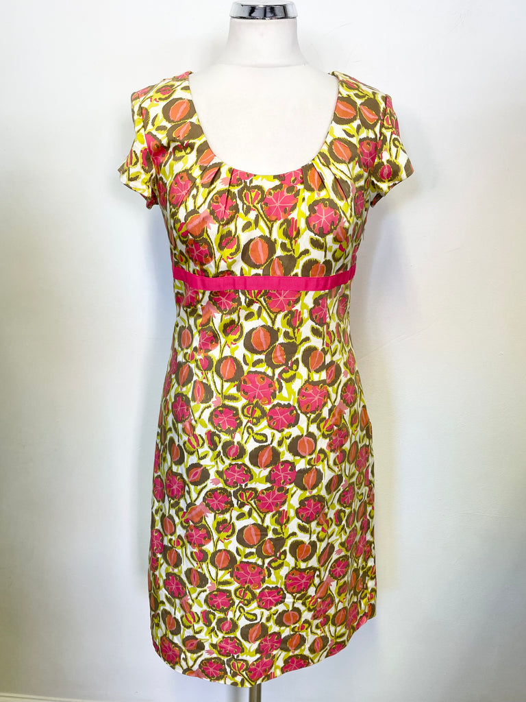 BODEN PINK & GREEN FLORAL PRINT CAP SLEEVED A-LINE DRESS SIZE 10