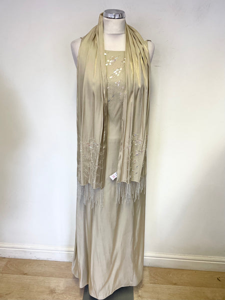 BRAND NEW WITH TAGS DEBUT PALE GOLD HAND EMBELLISHED EVENING DRESS & WRAP