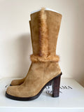BRAND NEW GIANFRANCO LAMA CAMEL SUEDE FUR TRIM HEELED BOOTS SIZE 5/38