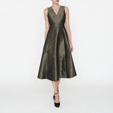 IN A STUNNING 1950s SILHOUETTE, THIS MIDI DRESS HAS A V NECKLINE AND A FIXED BODICE THAT NIPS IN AT THE WAIST BEFORE FALLING WITH A DRAMATIC FULL FLARE.