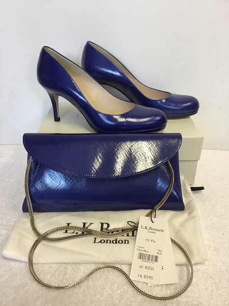 BRAND NEW LK BENNETT SYBILA UKTRA BLUE SAFFIANO PATENT HEELS & MATCHING CLUTCH / SHOULDER BAG SIZE 5.5/38.5