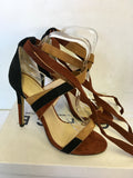 BRAND NEW IN BOX OFFICE BROWN,CAMEL & BLACK PATCHWORK SUEDE TIE ANKLE HIGH HEEL SANDALS