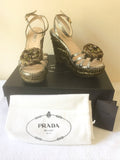 BRAND NEW PRADA PEWTER & BROWN RAFFIA WEDGE HEEL ANKLE STRAP SANDALS SIZE 4/37